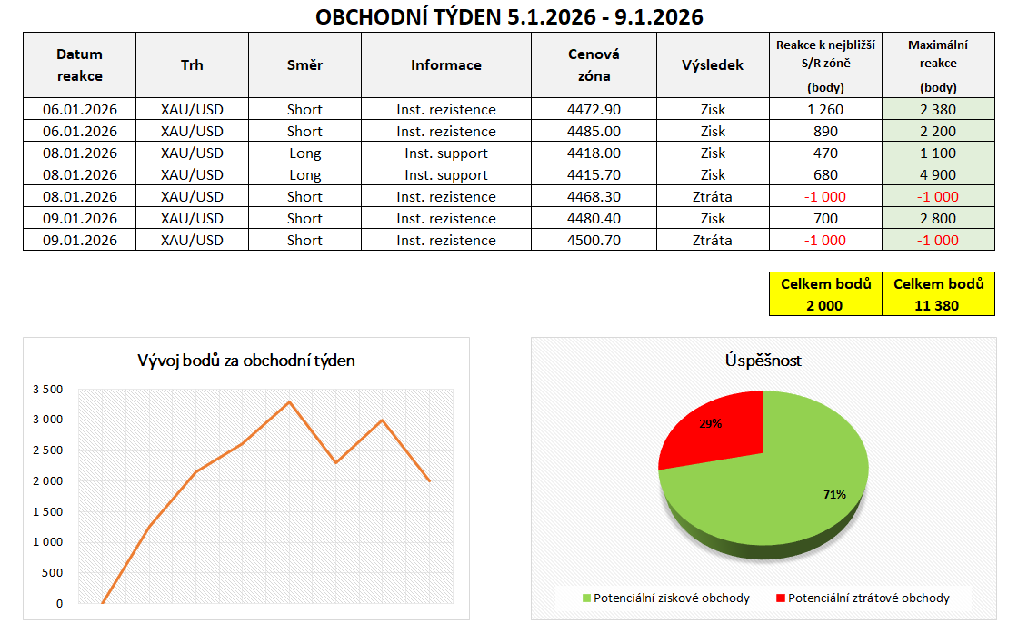 Nově rovněž zaznamenáváme reakce na trhu se zlatem (XAU/USD). Na tomto trhu byly minulý týden celkem 7 obchodních příležitosti, z nichž 5 bylo úspěšných. To představuje úspěšnost 71 %. Celkově bylo možné za minulý týden potencionálně zachytit reakce ve výši 2000 bodů. Pokud trh na institucionální objednávku nereagoval, zaznamenali jsme ztrátu 400 - 1500 bodů v závislosti na šířce dané institucionální objednávky a volatilitě.