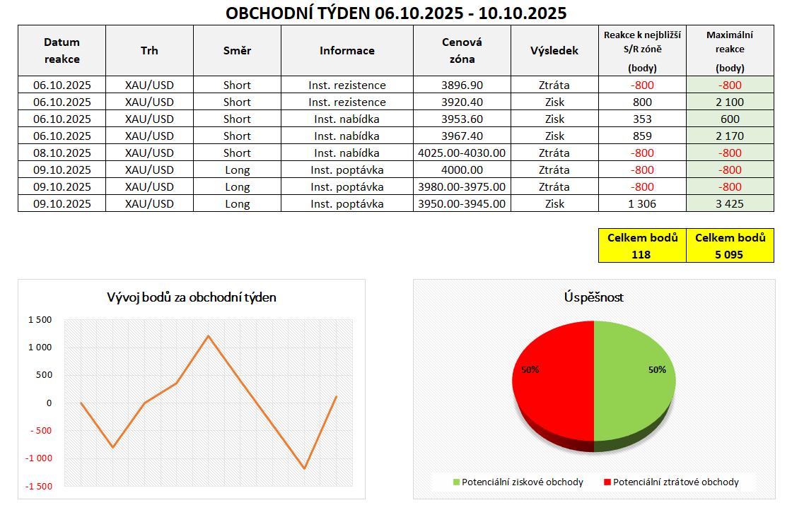 Nově rovněž zaznamenáváme reakce na trhu se zlatem (XAU/USD). Na tomto trhu bylo minulý týden celkem 8 obchodních příležitostí, z nichž 4 bylo úspěšné. To představuje úspěšnost 50 %. Celkově bylo možné za minulý týden potencionálně zachytit reakce ve výši 118 bodů. Pokud trh na institucionální objednávku nereagoval, zaznamenali jsme ztrátu 400 - 1000 bodů v závislosti na šířce dané institucionální objednávky a volatilitě.