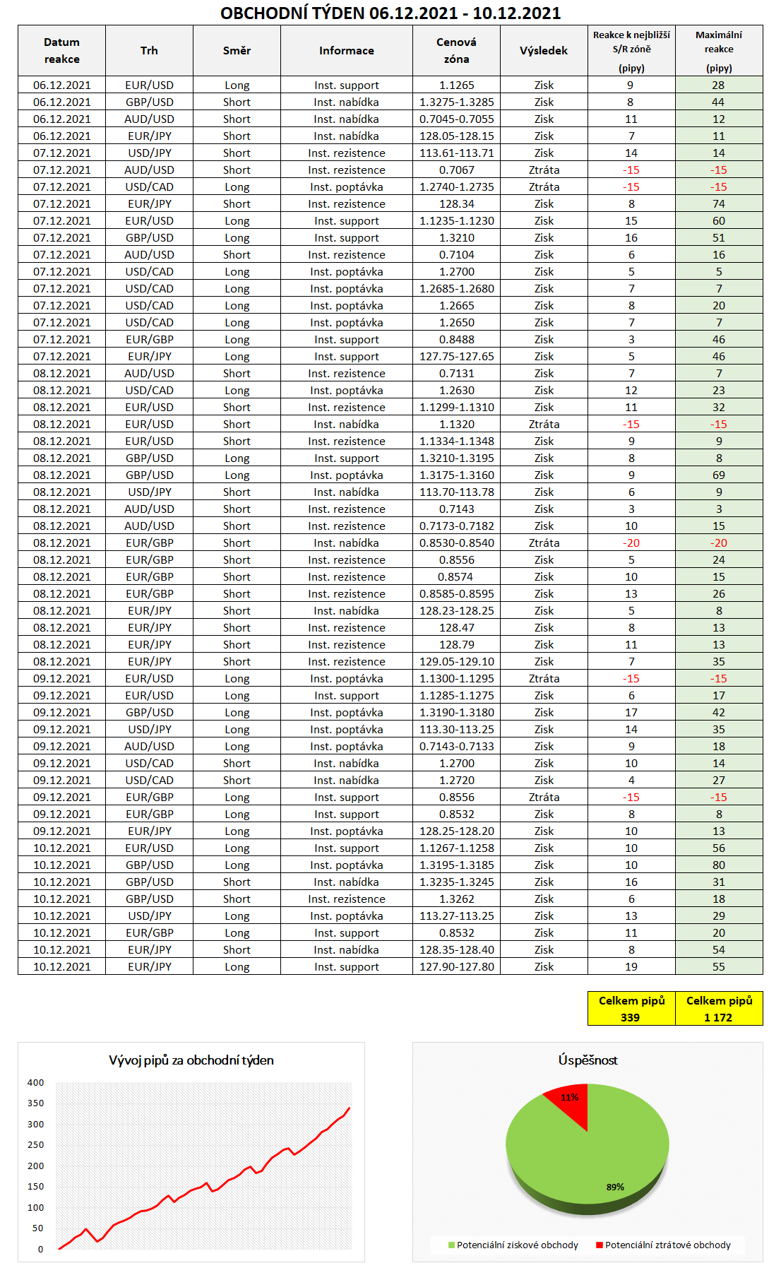 Na základě informací z mezibankovního trhu bylo v minulém týdnu možné vstoupit do 53 obchodů, z nichž 47 by bylo ziskových a 6 ztrátových. Celková úspěšnost tak byla 89 %. Celkově bylo možné za minulý týden potencionálně zachytit reakce ve výši 339 pipů, bereme-li v úvahu potenciální umístění Profit-Targetu k nejbližší S/R zóně. Stop-Loss naopak nejčastěji umisťujeme na logické místo ve vzdálenosti 15 - 20 pipů v závislosti na šířce dané institucionální objednávky. Konkrétní obchodní příležitosti jsme zaznamenali do tabulky níže, přidáváme také equity křivku v pipech.