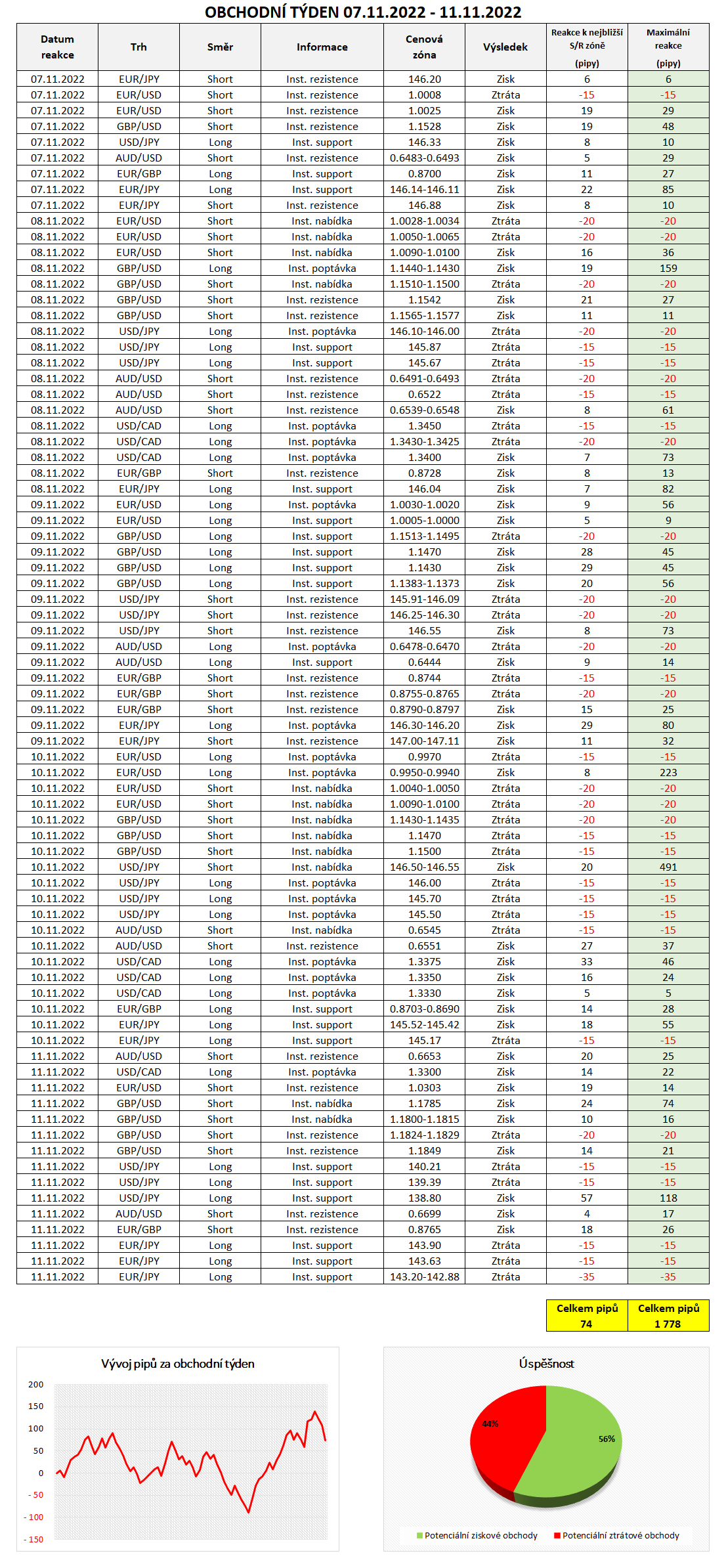 Na základě informací z mezibankovního trhu bylo v minulém týdnu možné vstoupit do 77 obchodů, z nichž 43 by bylo ziskových a 34 ztrátových. Celková úspěšnost tak byla 56 %. Celkově bylo možné za minulý týden potencionálně zachytit reakce ve výši 74 pipů, bereme-li v úvahu potenciální umístění Profit-Targetu k nejbližší S/R zóně. Stop-Loss naopak nejčastěji umisťujeme na logické místo ve vzdálenosti 15 - 20 pipů v závislosti na šířce dané institucionální objednávky. Konkrétní obchodní příležitosti jsme zaznamenali do tabulky níže, přidáváme také equity křivku v pipech.
