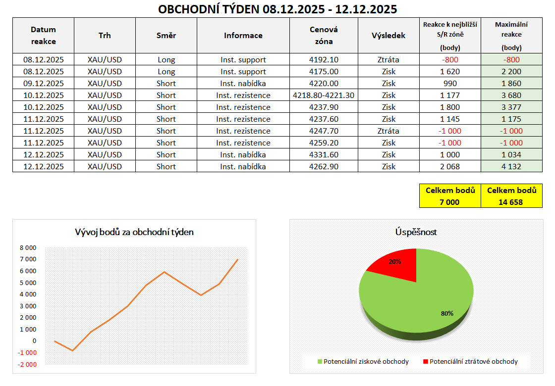 Nově rovněž zaznamenáváme reakce na trhu se zlatem (XAU/USD). Na tomto trhu byly minulý týden celkem 10 obchodních příležitosti, z nichž 8 bylo úspěšných. To představuje úspěšnost 80 %. Celkově bylo možné za minulý týden potencionálně zachytit reakce ve výši 7000 bodů. Pokud trh na institucionální objednávku nereagoval, zaznamenali jsme ztrátu 400 - 1500 bodů v závislosti na šířce dané institucionální objednávky a volatilitě.