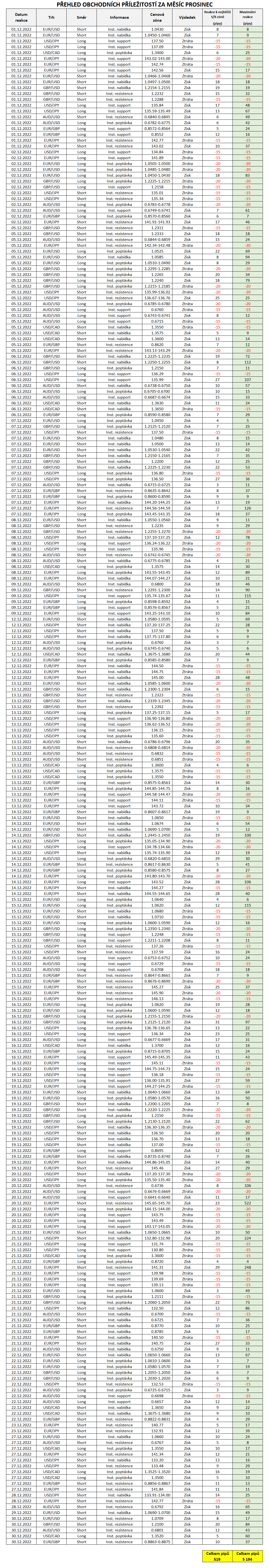 Toto shrnutí kompletně všech institucionálních objednávek z minulého měsíce slouží především jako statistika, jak trh na námi zveřejněné hladiny přesně reagoval a kolik bylo možné na všech obchodech vydělat pipů. Rozhodně ale nemusíte stihnout obchodovat každý den všechny naše zveřejněné institucionální objednávky, a přesto budete slušně ziskoví.