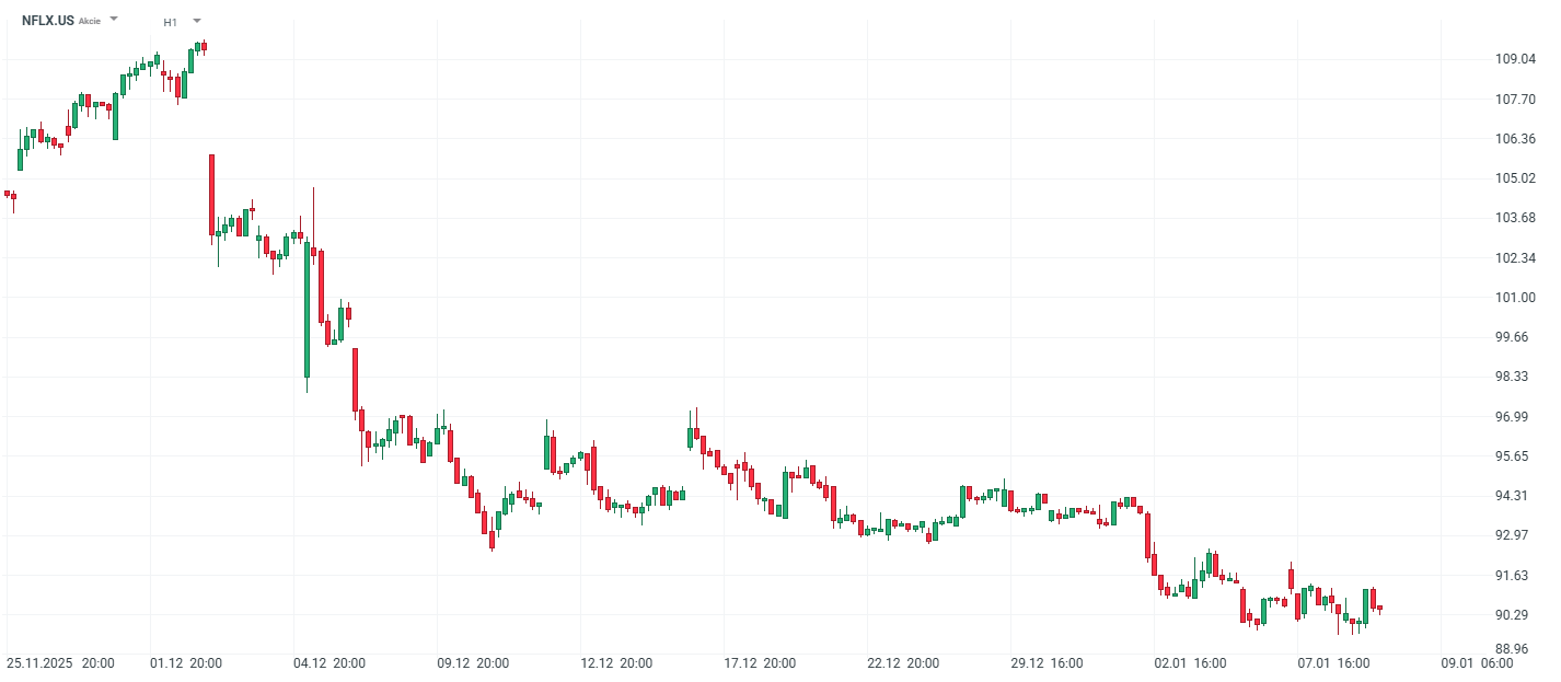 Vývoj ceny akcií Netflix (1hodinový graf - H1):