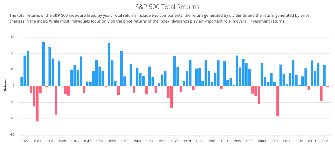 Americký index S&P 500 (US500) loni přidal zhruba 26 %, což je vzhledem k tradičně uváděnému ročnímu průměru mezi 8-10 % opravdu úspěch. Podobně dobře si však index vedl například i v letech 2019 a 2021. Výkonnost indexu v jednotlivých letech si můžete prohlédnout na obrázku níže.