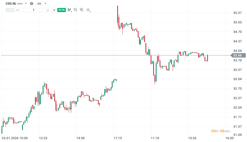 Vývoj ceny akcií CSG (CSG.NL). Zdroj: Investiční aplikace XTB. Minulé výsledky nejsou spolehlivým ukazatelem budoucích výsledků.