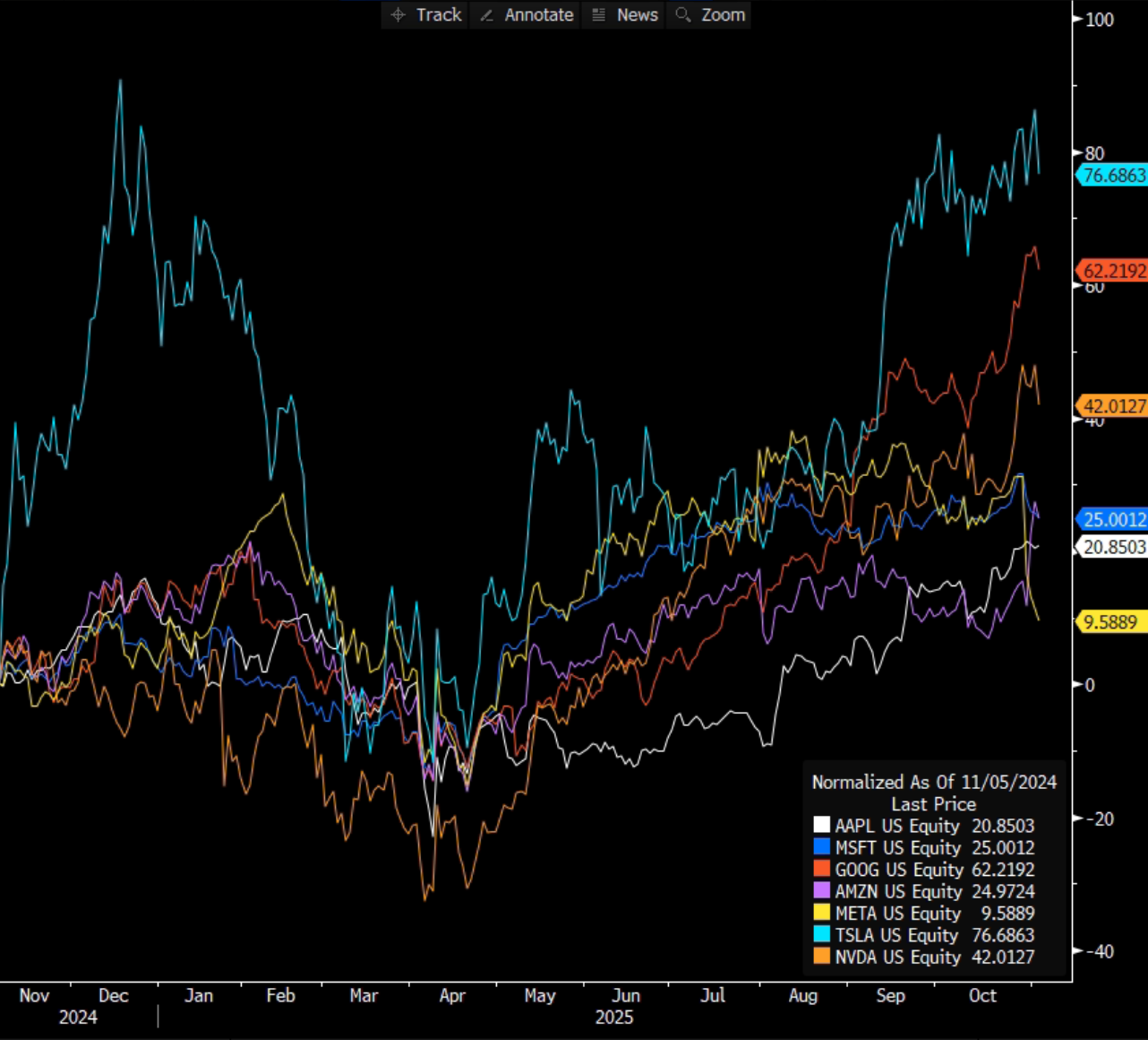 Také tentokrát platí, že všechny firmy kromě Tesly dosáhly za minulý kvartál velmi dobrých výsledků. Zhodnocení akcií skupiny Magnificent 7 za poslední rok můžete vidět na obrázku níže. Bez započítání dividend se zhodnocení akcií pohybuje mezi 10 a 77 %. Právě na výsledky těchto velkých technologických firem se podívali Tomáš Vranka, Jarda Brychta a Marek Nemky v rámci posledního dílu pořadu Povídání o trzích od XTB.