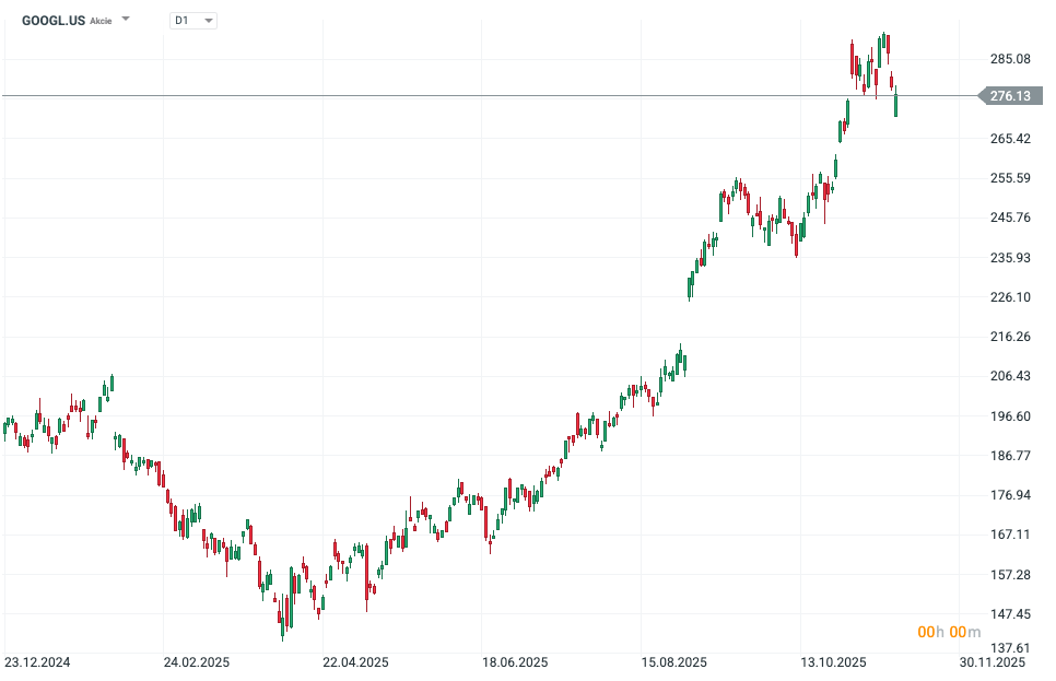 Vývoj akcií Alphabetu za poslední rok. Zdroj: xStation. Minulá výkonnost není spolehlivým ukazatelem budoucí výkonnosti.