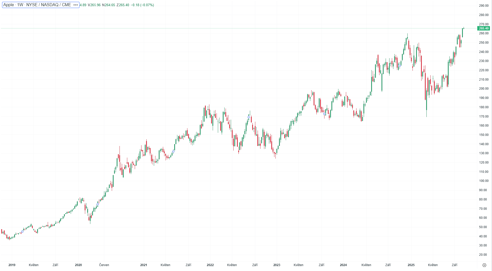 Vývoj ceny AAPL.US. Zdroj: Investiční aplikace XTB. Minulá výkonnost není spolehlivým ukazatelem budoucí výkonnosti.