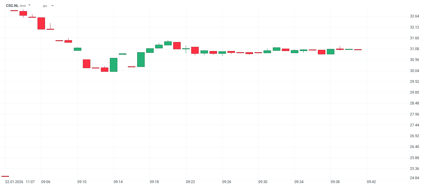 Vývoj ceny akcií CSG (1minutový graf - M1):