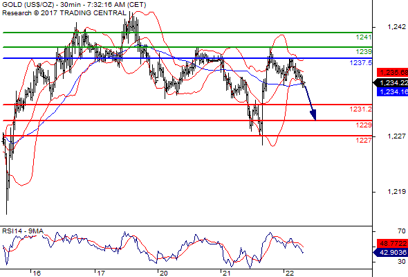 Preferovaný scénář: Krátké (short) pozice pod 1237,50 s cílem na 1231,20 a dále pak až na 1229,00.