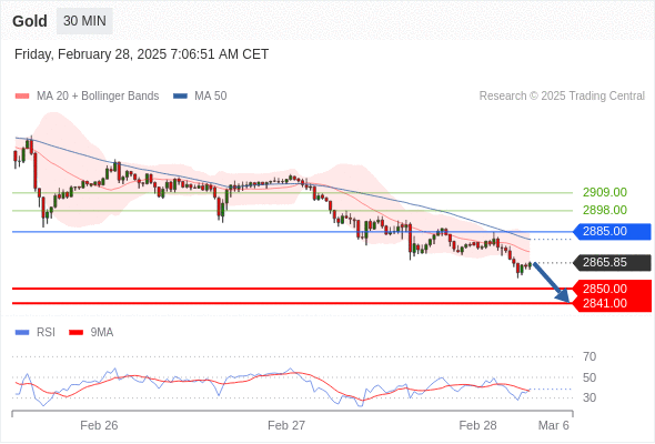 Alternativní scénář: Nad 2885,00 je pravděpodobný růst na 2898,00 a dále pak až na 2909,00.