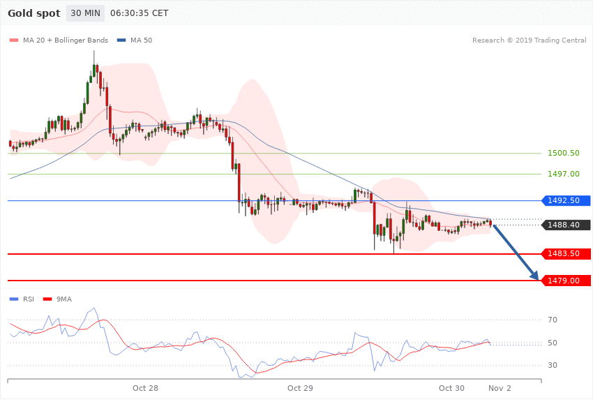 Komentář: Dokud se cena zlata bude obchodovat pod rezistencí 1492,50, tak je pravděpodobný pokles směrem k hladině 1483,50.