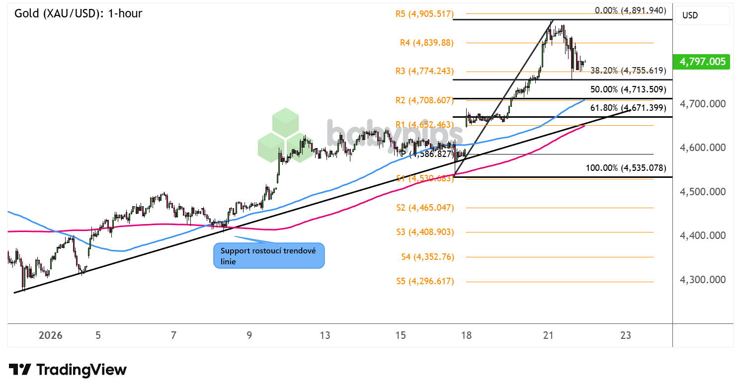 Vývoj ceny zlata XAU/USD (4hodinový graf – H4):