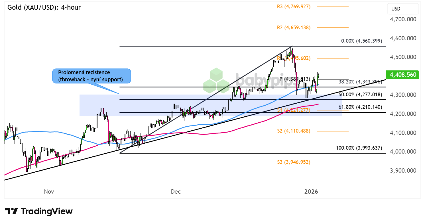 Vývoj ceny zlata XAU/USD (4hodinový graf – H4):