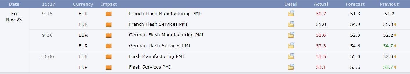 Séria slabých dát z eurozóny pokračuje. Dnes sklamali všetky relevantné čísla z podnikovej dôvery z eurozóny a jej najväčších ekonomík. Kompozitný index dôvery (výroba+služby) klesol na úroveň 52,4., čo je najmenej za posledných 2,5 roka. Je však potrebné dodať, že index je stále nad úrovňou 50b., ktorý oddeľuje rast od poklesu. Aktivita v podnikovej sfére teda rastie, avšak stále pomalšie a pomalšie.