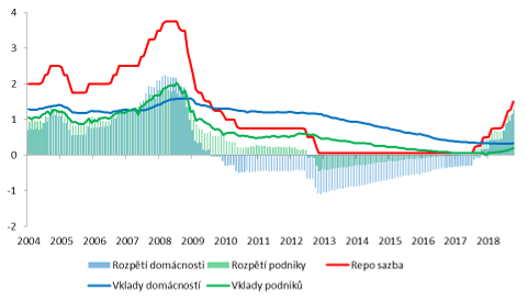 Žádné selhání transmise se dle aktuálních dat nekoná ani u úrokových sazeb z vkladů. Pozorovaná data ukazují, že rozpětí klientských a tržních sazeb v minulosti dosahovalo výrazně kladných, ale i záporných hodnot (Graf 6). Zde byl vývoj ovlivněn nulovou dolní hranicí pro pohyb sazeb, která byla pro český bankovní sektor velmi relevantní. V letech 2004–2012, tj. v období před kurzovým závazkem, dosáhlo průměrné rozpětí mezi dvoutýdenní repo sazbou ČNB a úrokovou sazbou z korunových vkladů přijatých bankami od domácností a podniků 0,5, resp. 0,8 procentního bodu. V dosavadním průběhu roku 2018 dosahuje průměrná výše tohoto rozpětí 0,6 resp. 0,8 procentního bodu. Ani přenos měnověpolitických sazeb do sazeb depozitních se tedy nijak dramaticky nezhoršil.