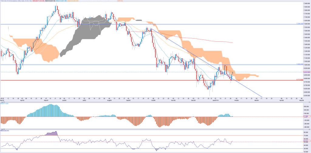FTSE 100 dosáhl intraday high 6 898 a v současné době se obchoduje kolem 6 893.Technicky je index vystaven silnému odporu kolem 7 000 a další vzestup je akceptovatelný pouze nad touto úrovní. Posun na 7 140/7 200 je možný, pokud se index bude obchodovat nad úrovní 7 000. Odpor je na úrovni 6 905 (55 denní EMA).