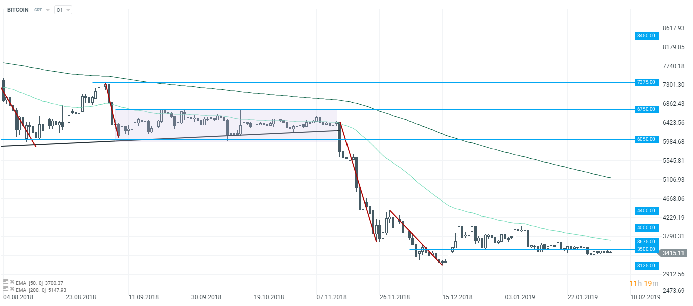 Bitcoin (BITCOIN v xStation5) nezaznamenal od polnoci žiadne výraznejšie pohyby, počas dnešného obchodvania len jemne klesá a pohybuje sa pri úrovni $3415. Zdroj: xStation5