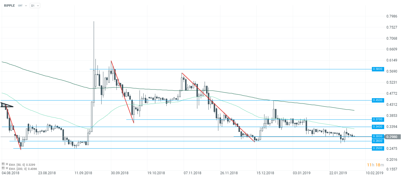 Ripple (RIPPLE v xStation5) zaznamenal štyri klesajúce sviečky na dennom grafe a pod miernym tlakom je aj počas dnešného obchodvoania. Zdroj: xStation5