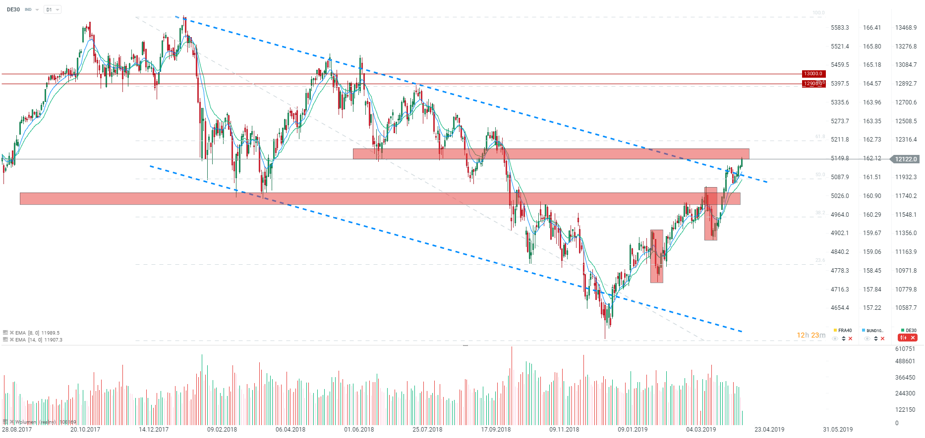 Německý index v úterý posiluje na nejvyšší hodnoty za posledních 6 měsíců. Vzhůru je poháněn klesající rizikovou averzí, která se projevuje také na dalších rizikových aktivech. Zlepšení přichází po zveřejnění sady pozitivních markodat, která naznačují, že se světové ekonomice daří relativně dobře. Globálnímu sentimentu pomáhá zvýšená úvěrová aktivita Číny a také data z Německa nenaznačují výrazné problémy (například dnešní ZEW index, který dopadl mírně nad očekávání). Z technického pohledu DE30 testuje důležitou rezistenci. Dalo by se očekávat, že cena bude ještě bojovat o úrovně okolo 12 200 bodů. Pokud bude DAX skutečně potřebovat výběr zisků a korekci, tak ta by mohla index přivést až k úrovni 50 % retracementu posledního poklesu.