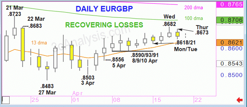 Signály minulý týždeň poukazovali na rast a tento bol aj potvrdený, keď pár vytvoril tretie vyššie týždenné minimum za sebou a počiatočný zisk takmer ½ veľkého čísla. Avšak predajcovia sa vrátili na trh pri cenovej úrovni okolo .8695 a 100 dennom kĺzavom priemere, keď sentiment sa zhoršil a pár uzavrel týždeň iba s malou zmenou. Strata rastového sentimentu môže byť varovaním pre býkov, ale pri absencii predajného signálu je výhľad na tento týždeň opatrne býčí, a náš výhľad predpokladá opatrný nákup pri otvorení trhu, ale s ponechaním priestoru na nákup pri poklese ku .8623, minimum minulý týždeň. Riziko predpokladáme v poklese pod .8556, základňa 5. apríla. Cieľ predpokladáme v raste ku .8673/82, maximá z minulého týždňa, .8723, maximum v marci a .8765, 200 denný kĺzavý priemer.
