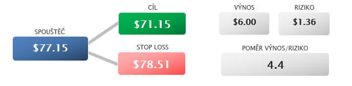 Počáteční prodej může být aktivován pod cenou 77,15 USD. Stop-loss umístíme nad nastavenou resistenci, čímž riskujeme pouze 2 %. Pokud bude korekce pokračovat, naším cílem bude 200-denní klouzavý průměr.