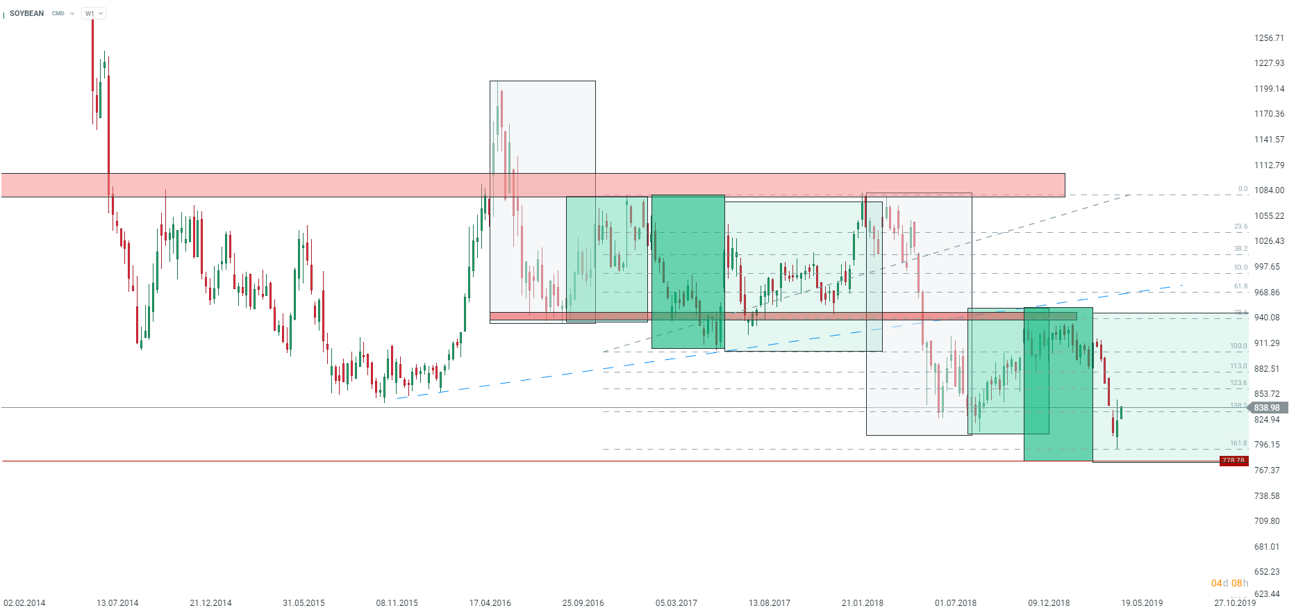 Rostoucí momentum na obilovinách je primárně k vidění na kukuřici. Nicméně hlavní důvod pro růst této komodity je stejný jako na sójových bobech - statistiky osetí. Co se týká sójových bobů, tak je oseto pouze 19 % z celkové plánované plochy. Pětiletý průměr pro toto období je 47 % a v minulém roce tato statistika dosáhla až na 53 %. Za zpožděním stojí hlavně 2 faktory. Přetrvávající vlhkost půdy po povodních a deštivém období z prvních měsíců roku. Dalším a pravděpodobně důležitějším faktorem je nejistota ohledně čínské poptávky, která by se kvůli obchodním sporům s USA mohla kompletně vytratit. A to je zároveň hlavním důvodem, který by mohl stát za případným rychlým poklesem ceny. Ta vystoupala zpět na externí 138,2 % Fibo úroveň a nad lokální minima z poloviny minulého roku. Nejbližší rezistence je umístěna na úrovních 860 a 880 centů.