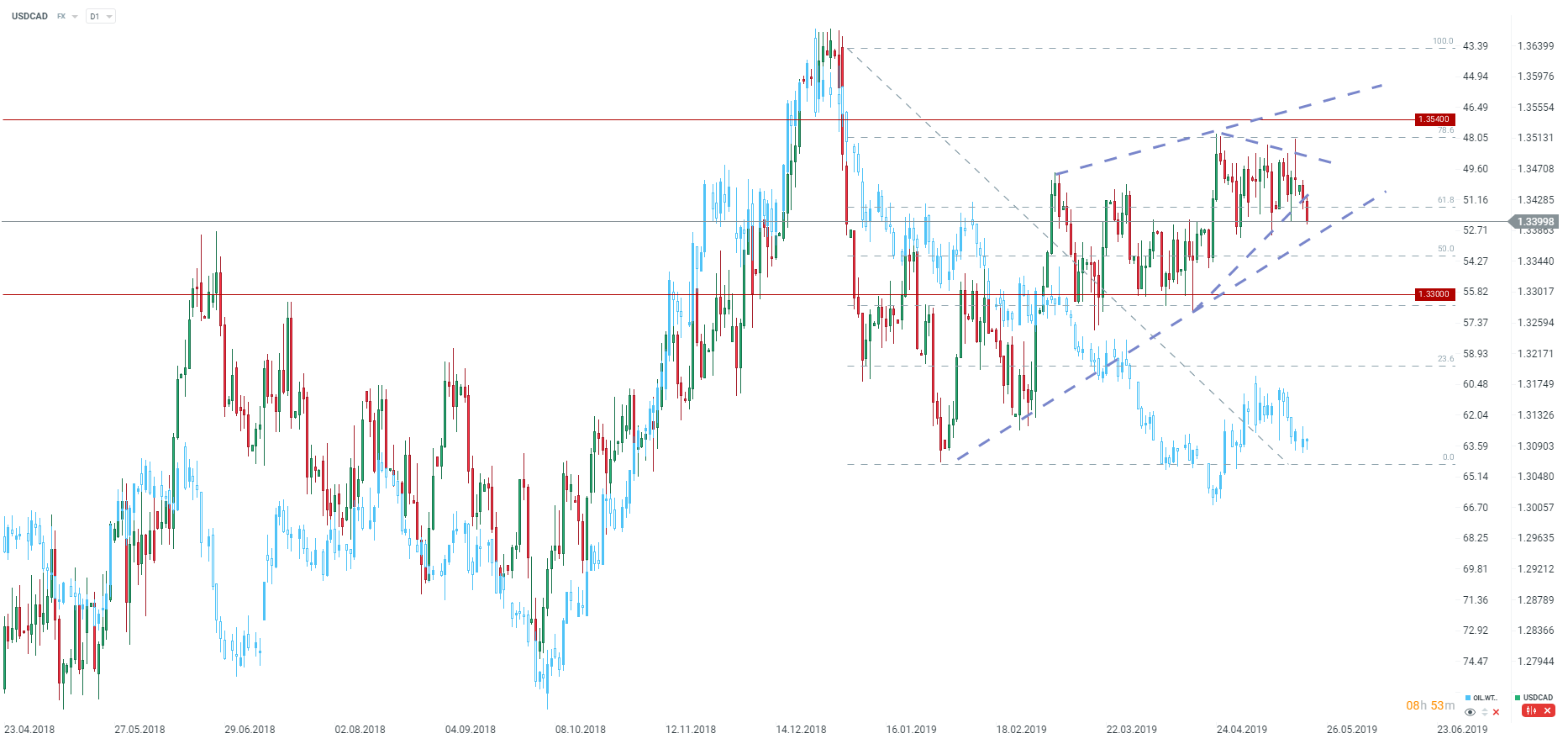 Kanadský dolar patří mezi nejvíce rostoucí měny v tomto týdnu. Hlavním důvodem je odraz cen ropy na vyšší hodnoty a také poznámky amerického prezidenta Donalda Trumpa ke clům na ocel a hliník. Ropa se obchoduje na vyšších úrovních kvůli situaci na Středním východě, nicméně nejvyšší impuls pro CAD znamenalo rozhodnutí Donalda Trumpa vyjmout Kanadu a Mexiko z celního režimu na ocel a uhlí. Tento krok je předzvěstí ratifikace smlouvy USMCA - náhradě NAFTA. Pár USDCAD se obchoduje pod úrovní 1,34 a dostal se pod spodní limitu trojúhelníkového patternu. Pokud bude pokles dále pokračovat, tak se nedá vyloučit otestování nižší úrovně rostoucí klínové formace.