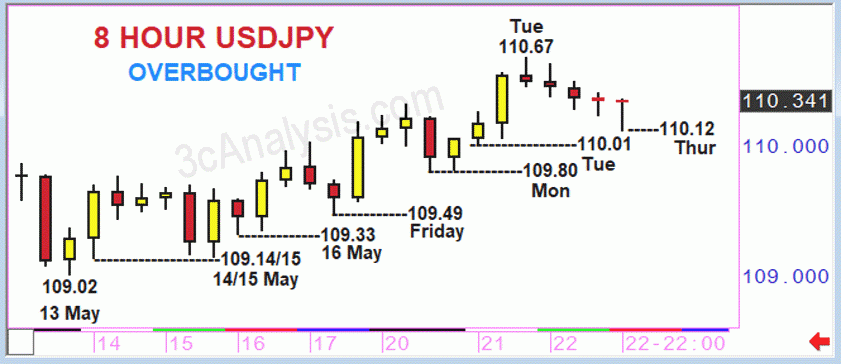 Napriek tomu, že utorkové signály boli potvrdené silným rastom a šiestym vyšším denným minimom v rade, pár testuje 50 a 100 denný kĺzavý priemerpriemer a výhľad na stredu bol opatrnejší a neutrálny. Toto bolo potvrdené, keď pár bol obchodovaný do strán vo vnútri utorkového rozsahu, aby zatvoril obchodný deň s miernym poklesom. Pokles je mierne negatívny a ďalšie straty v Ázii, hoci tieto neboli udržané, ukončili trend vyšších denných miním. Takže so signálmi poukazujúcimi na pokles, náš výhľad na dnes je medvedí a predpokladá predaj pri otvorení trhu, ale s ponechaním priestoru na predaj pri raste ku 110.49, včerajšie otvorenie trhu. Riziko predpokladáme v raste nad 110.85, maximum 7. mája. Cieľ predpokladáme v poklese ku 110.17, dnešné minimum počas ázijskej obchodnej seansy, 109.80, základňa tento týždeň a 109.49, minimum v piatok.