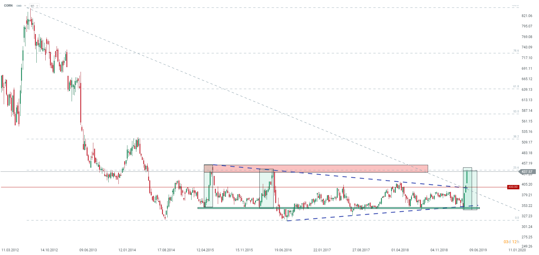 Ceny kukuřice vzrostly z cen v okolí 350 centů za bušl a dostaly se tak nad lokální maxima z druhé poloviny roku 2018. Aktuálně se ceny blíží důležité zóně nabídky (v okolí 400 centů), kde se potkávají s 23,6 % Fibo retracementem poslední velké medvědí vlny. Aktuální cenový nárůst není na tomto trhu výjimečný.