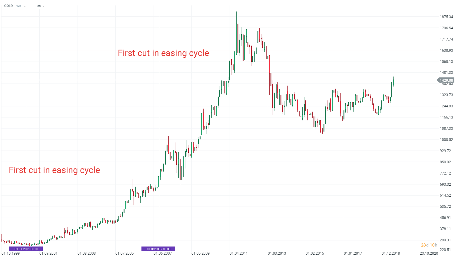 Dva minulé cykly uvolňování měnové politiky pomohly výrazně k nárustu ceny zlata. Zdroj: xStation5
