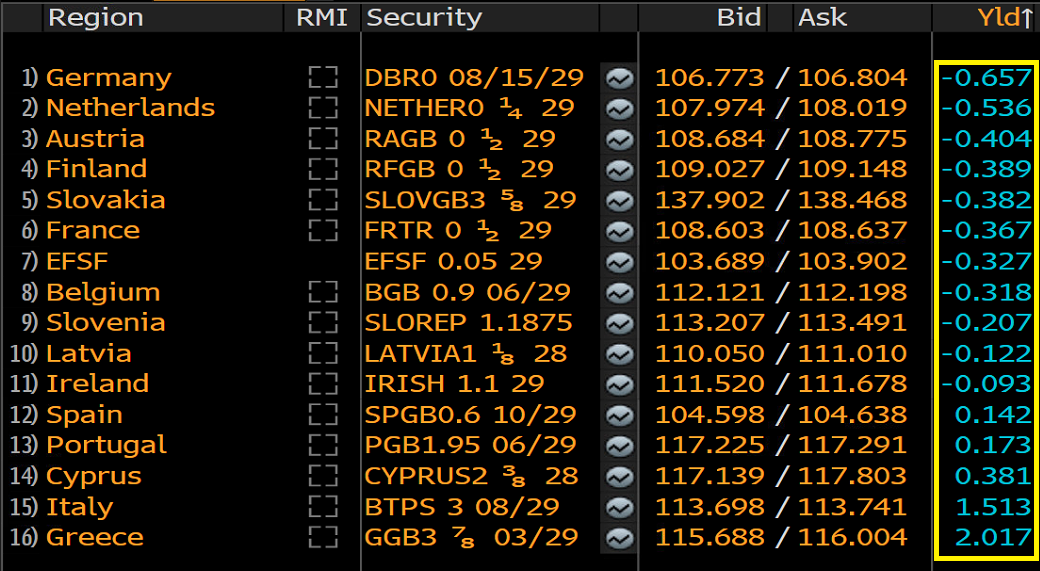 Problém však je, že už si 11 krajín eurozóny požičiava na 10 rokov so záporným výnosom, vrátane Slovenska (žltý rámček na grafe vyššie). Zdroj: Bloomberg