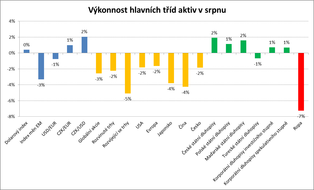 · Celkově byl v srpnu přítomna zvýšená riziková averze, zejména kvůli obchodní válce, Brexitu a situaci v Itálii. Navíc makroekonomická data překvapovala spíše negativně. Výsledkem byl pokles akciových trhů, byť nijak zásadní.