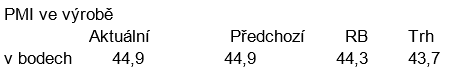 Český index nákupních manažerů ve výrobě zůstal na srpnové úrovni 44,9 bodů. Sentiment českých průmyslníků se přestal zhoršovat a stabilizoval se nicméně na velmi nízké úrovni z doby před globální finanční krizí. Bohužel je již 10. měsíc pod úrovní 50 bodů, což stále odpovídá poklesu průmyslové výroby.