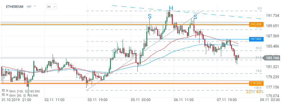 Technicky Ethereum neustále konsoliduje v páse 190 a 178 dolárov. Po vytvorení vzoru hlavy a ramien na hodinovom grafe, predajcovia prevzali kontrolu nad trhom a tlačili cenu oveľa nižšie. Najbližšia oblasť podpory sa nachádza okolo úrovne 178 dolárov. Ak však kupujúci zvíťazia, mohlo by dôjsť k posunu k hladine 187 USD. Ak by cena pokračovala v pohybe smerom nahor, otvoril by sa priestor na rast k úrovni 190 dolárov. Zdroj: xStation5