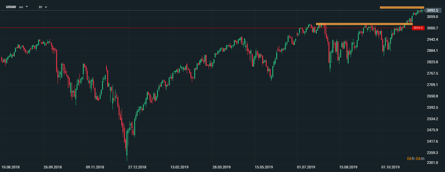 Americký akciový index US500 zotrváva blízko historicky najvyšších úrovní a v súčasnosti testuje psychologickú hranicu 3100 bodov. V prípade, ak dokáže uzavrieť denná sviečka nad vyššie spomínanou úrovňou, otvorí sa priestor pre rast k hladine 3200 bodov. Zdroj: xStation