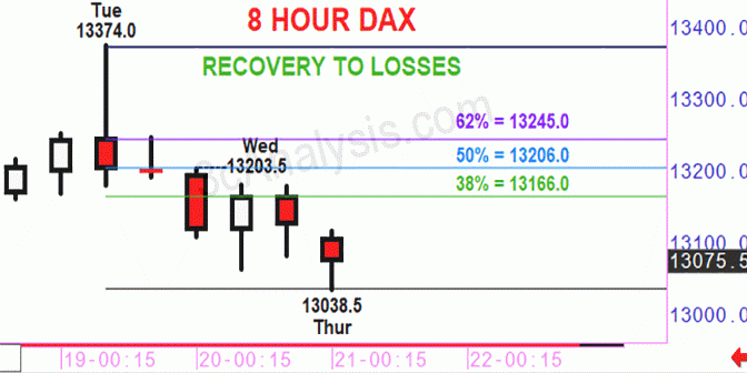 Medvedie signály v týždni boli potvrdené počiatočnými stratami nad 350 bodov. Avšak s vnútrodenným prepredaným sentimentom a predajcami, ktorí sa v utorok vrátili na trh z úrovne 13182, Marabuzo čiaru vytvorenú 8. januára, bol náš včerajší výhľad zostať nečinní pri otvorení trhu a predať iba rast. Bola to správna stratégia, pretože počiatočné zisky boli vypustené a trh zatvorilnakoniec iba s malým pohybom. Predajcovia sa dnes ráno vrátili na trh v Ázii a signály naďalej poukazujú na pokles. Preto náš dnešný výhľad predpokladá predaj pri otvorení trhu, ale s ponechaním priestoru na predaj rastu ku 13311.5, dnešné maximum v Ázijskej obchodnej seanse. Riziko predpokladáme v raste nad 13373.5, včerajšie maximum. Cieľ predpokladáme v poklese ku 13167.5, minimum tohto týždňa, 13002, otvorenie trhu 8. januára a 12939, tohtoročná základňa. -