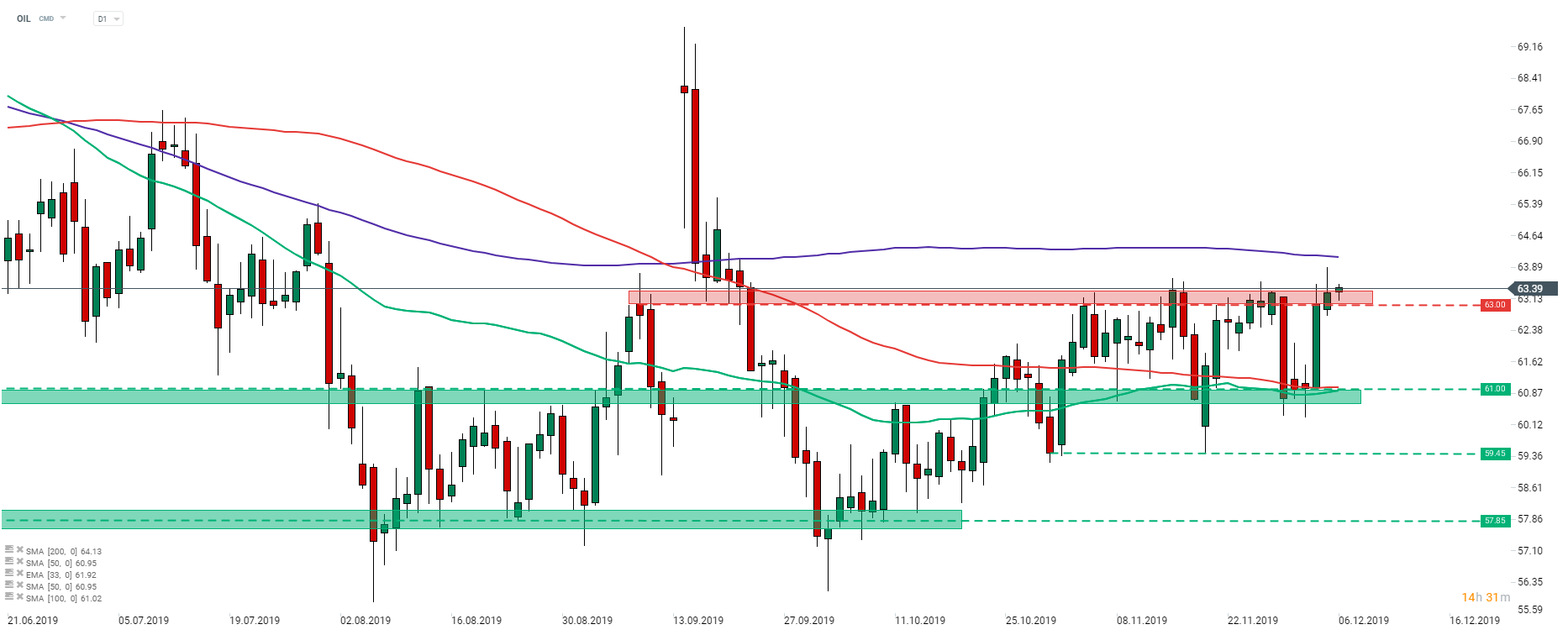 Brent (OIL) se pokouší prolomit horní hranu konsolidačního pásma v okolí 2,5 měsíčního maxima. Pokud se dočkáme dalšího snížení produkce, může se jednat o dostatečný stimul k tomu, aby se obchodníkům prolomení tohoto pásma podařilo. Zdroj: xStation5Klíčová slova: Rusko | OPEC | Ceny ropy | Brent | Ropy | Trh | Zprávy | Konsenzus | OPEC+ | Zasedání OPEC |