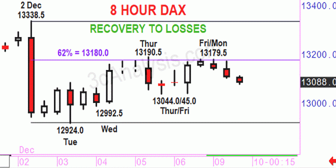 Medvedie signály v týždni boli potvrdené počiatočnými stratami nad 350 bodov. Avšak s vnútrodenným prepredaným sentimentom a predajcami, ktorí sa v utorok vrátili na trh z úrovne 13182, Marabuzo čiaru vytvorenú 8. januára, bol náš včerajší výhľad zostať nečinní pri otvorení trhu a predať iba rast. Bola to správna stratégia, pretože počiatočné zisky boli vypustené a trh zatvorilnakoniec iba s malým pohybom. Predajcovia sa dnes ráno vrátili na trh v Ázii a signály naďalej poukazujú na pokles. Preto náš dnešný výhľad predpokladá predaj pri otvorení trhu, ale s ponechaním priestoru na predaj rastu ku 13311.5, dnešné maximum v Ázijskej obchodnej seanse. Riziko predpokladáme v raste nad 13373.5, včerajšie maximum. Cieľ predpokladáme v poklese ku 13167.5, minimum tohto týždňa, 13002, otvorenie trhu 8. januára a 12939, tohtoročná základňa. -