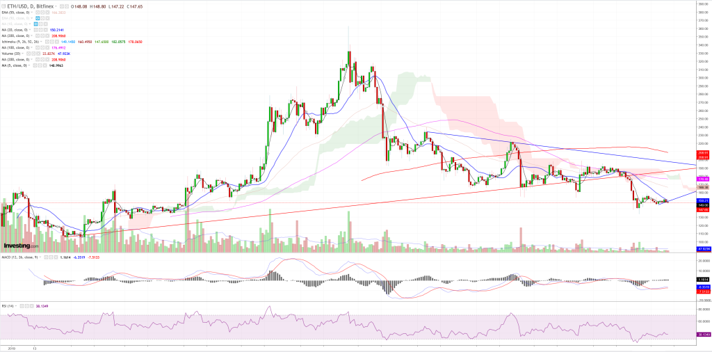ETH/USD se pohybuje kolem 5-DMA, hlavní trend zůstává medvědí. Dvojice se obchodovala na 147,69 v 07:05 GMT po uzavření +1,32% v předchozí seanci. -