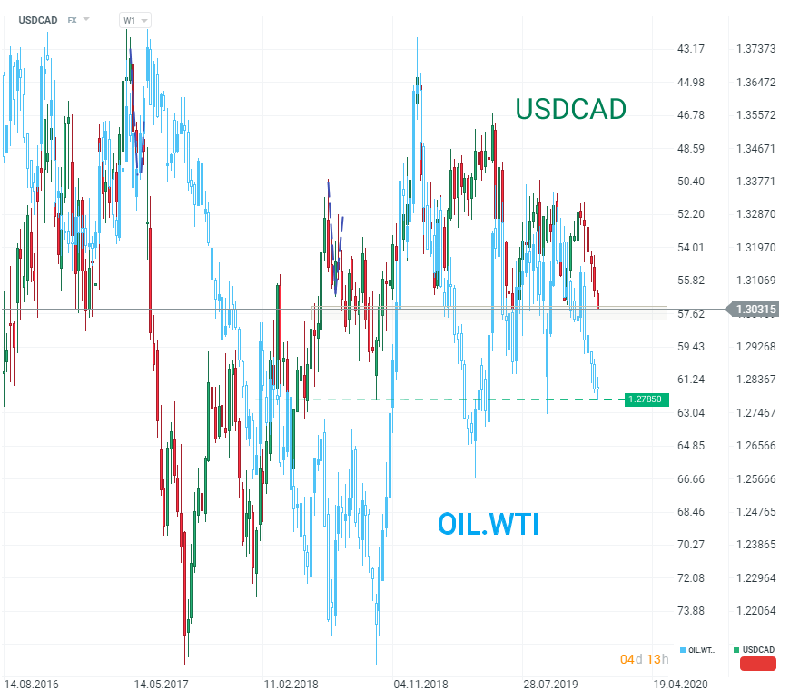 Vyšší ceny ropy (zobrazeny inverzně) pomohly páru USDCAD na nižší úrovně. Další úrovní, na kterou by se měli obchodníci zaměřit, je support na 1,2785. Zdroj: xStation5