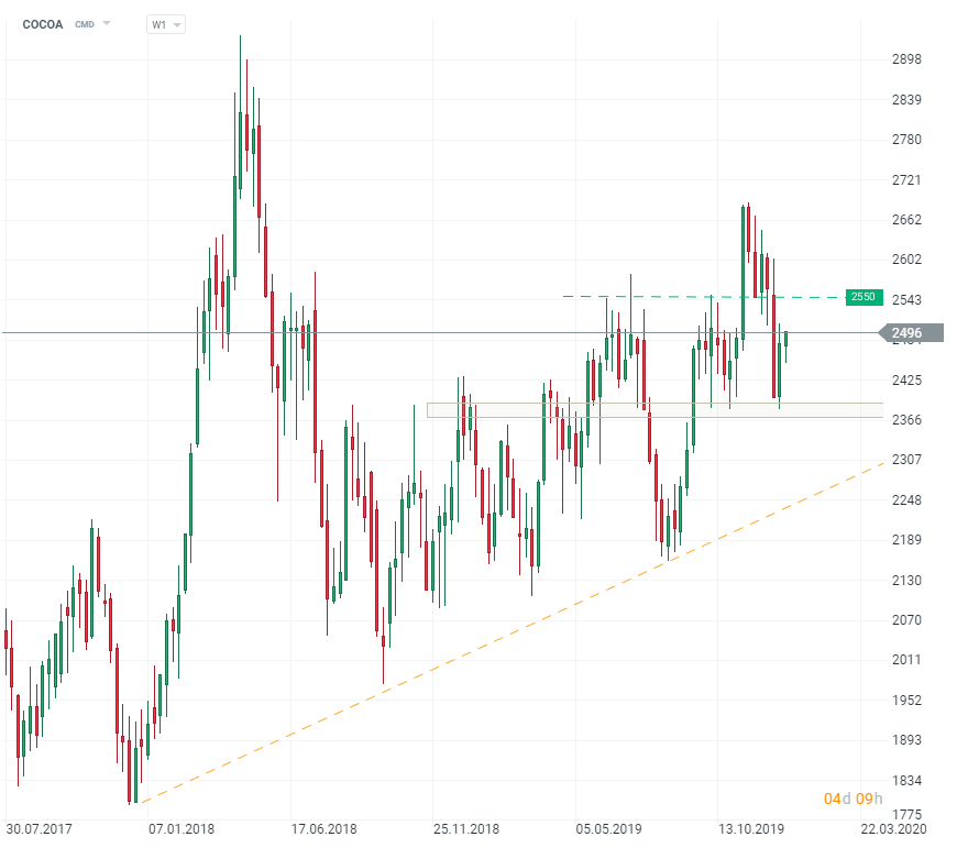 Poslední den roku 2019 přináší pokračování zisků na komoditních trzích. To platí hlavně pro drahé kovy jako platina (+1,2 %) a stříbro se ziskem +0,7 %. Oba tyto trhy se obchodují nejvýše v prosinci. Nejvíce dnes roste kakao - o +1,3 %. Tato komodita pokračuje v korekci předchozích hlubokých poklesů. Býci doufají v návrat růstového trendu. Další důležitou hladinou je směrem vzhůru úroveň 2550 dolarů.