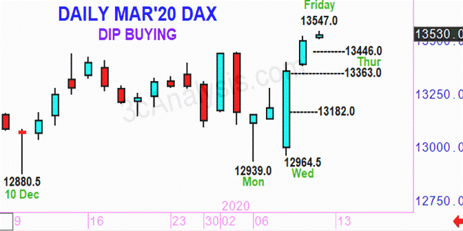 Medvedie signály v týždni boli potvrdené počiatočnými stratami nad 350 bodov. Avšak s vnútrodenným prepredaným sentimentom a predajcami, ktorí sa v utorok vrátili na trh z úrovne 13182, Marabuzo čiaru vytvorenú 8. januára, bol náš včerajší výhľad zostať nečinní pri otvorení trhu a predať iba rast. Bola to správna stratégia, pretože počiatočné zisky boli vypustené a trh zatvorilnakoniec iba s malým pohybom. Predajcovia sa dnes ráno vrátili na trh v Ázii a signály naďalej poukazujú na pokles. Preto náš dnešný výhľad predpokladá predaj pri otvorení trhu, ale s ponechaním priestoru na predaj rastu ku 13311.5, dnešné maximum v Ázijskej obchodnej seanse. Riziko predpokladáme v raste nad 13373.5, včerajšie maximum. Cieľ predpokladáme v poklese ku 13167.5, minimum tohto týždňa, 13002, otvorenie trhu 8. januára a 12939, tohtoročná základňa. -