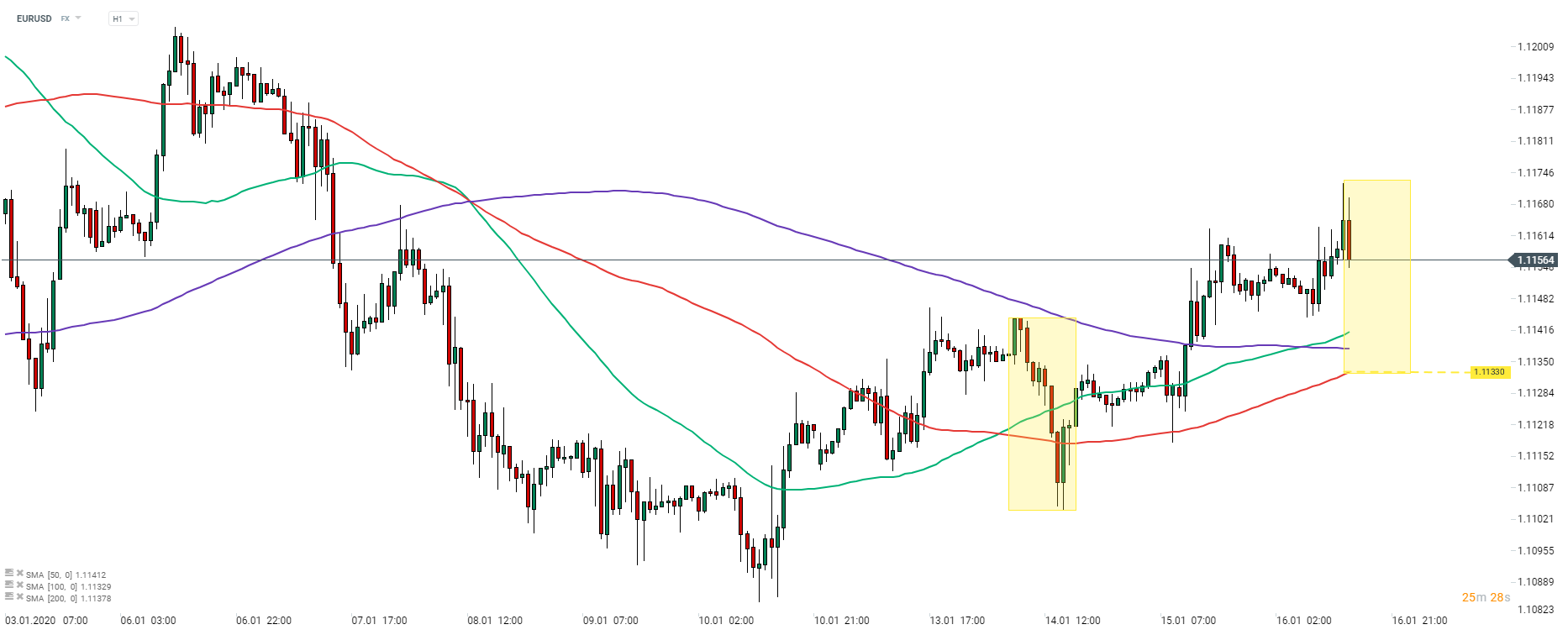 Menový pár EURUSD začal klesať po pozitívnej správe o maloobchodných predajoch v USA. Najbližšiu podporu nájdete pri úrovni 1,1133 - 100-hodinovom kĺzavom priemere (červená čiara) a dolnej hranici lokálnej štruktúry 1: 1. Zdroj: xStation5