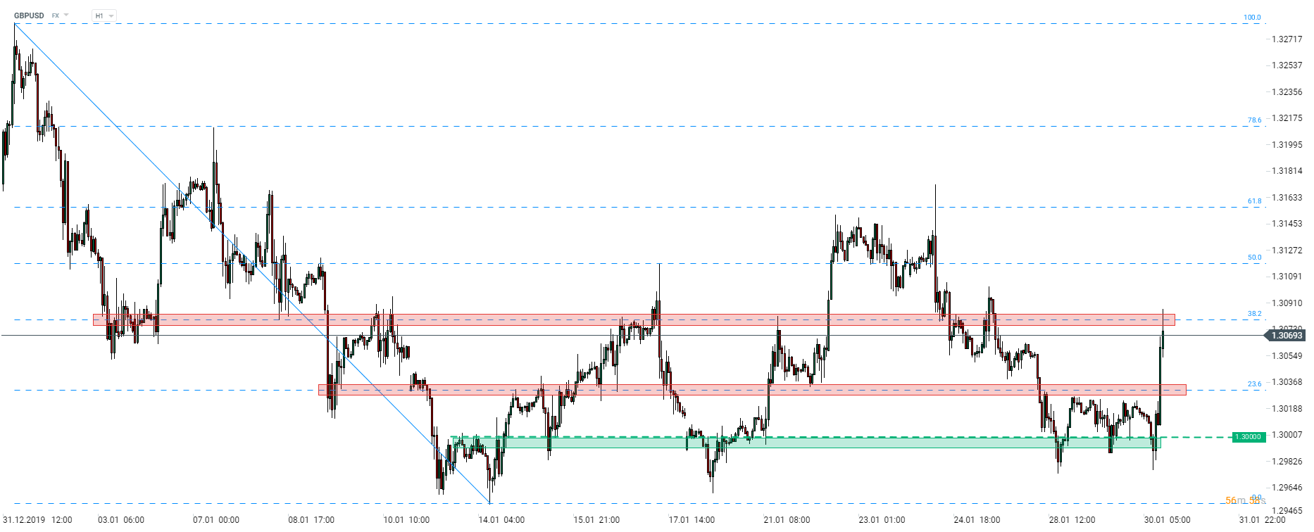 GBPUSD prorazil své krátkodobé obchodní rozpětí a otestoval rezistenci na úrovni 38,2 % Fibo poklesu s počátkem na začátku roku (1,3080). Zdroj: xStation5