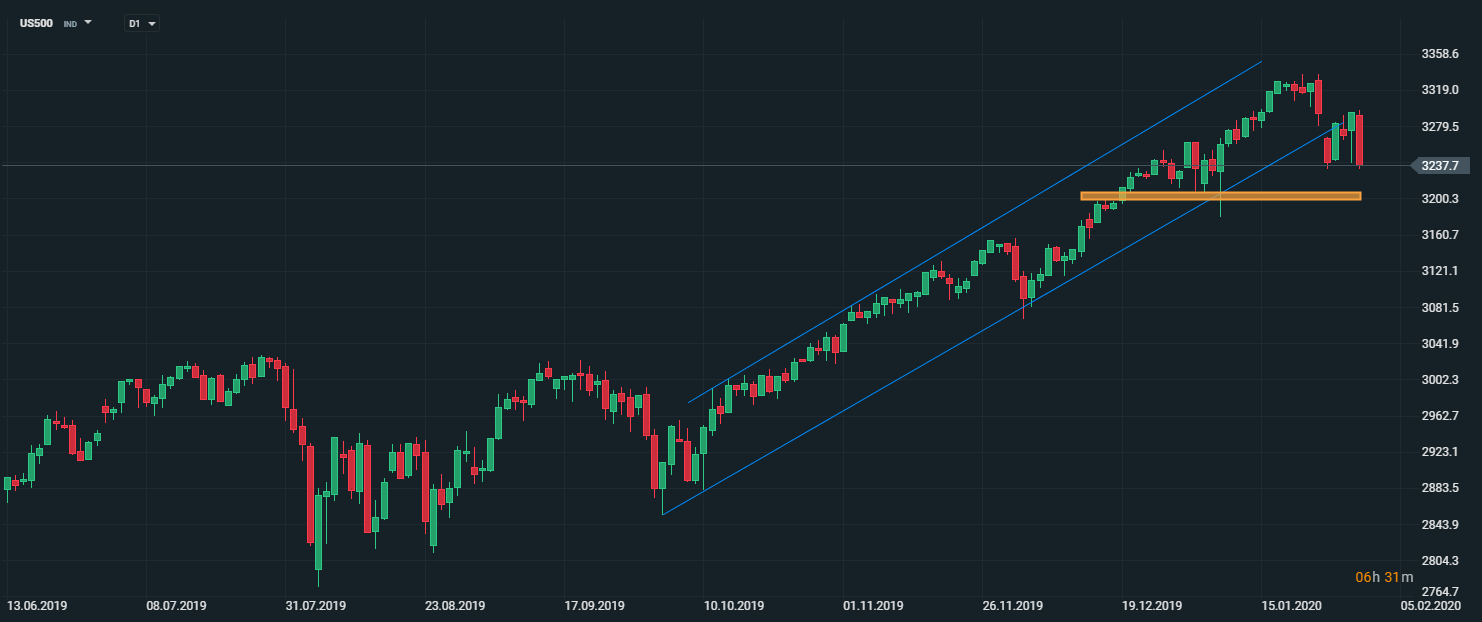 Americký akciový index US500 sa blíži k lokálnym minimám na úrovni 3230 bodov. V prípade, ak cena dokáže spomínanú hranicu prekovať, otvorí sa priestor na pokles k supportu na hladine 3200 bodov. Zdroj: xStation5