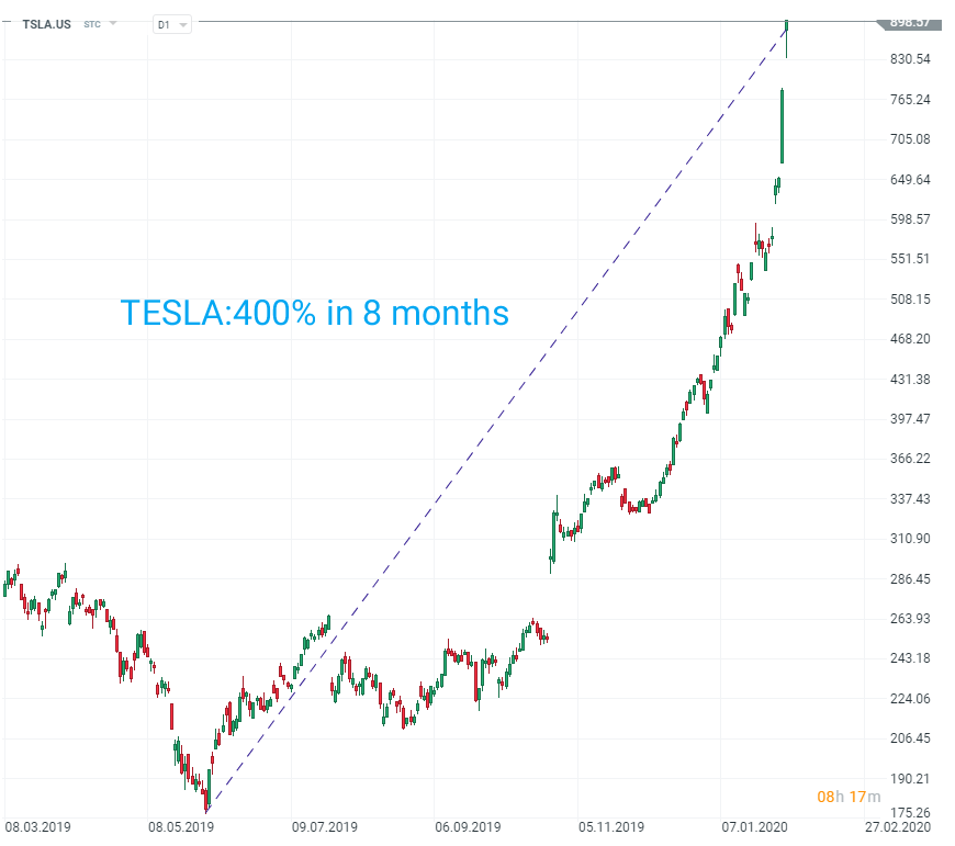 V utorok pokračujú akcie spoločnosti Tesla (TSLA.US) v prudkom raste. Cena akcií zaznamenala nárast o 40% za dva dni, viac ako 110% od začiatku roka a viac ako 400% za posledných 8 mesiacov. Zdá sa, že ide o uzatváranie krátkych pozícií, pretože neexistujú žiadne nové relevantné informácie. Tesla teraz stojí viac ako GM, Ford, Fiat, Chrysler a Daimler dohromady! Táto eufória sa šíri po celom trhu, pričom rastie aj index US100 aj napriek prepuknutiu vírusu v Číne.