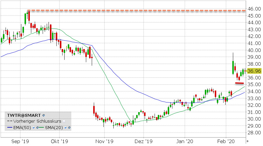 Twitter, Inc. (TWTR) nabízí svým zákazníkům komunikační platformu pro zasílání krátkých zpráv. Uspokojivé kvartální výsledky společnosti byly zveřejněny 6. února 2020, což vedlo k velkému gapu směrem nahoru. To lze interpretovat jako zvýšený zájem o společnost mezi investory.