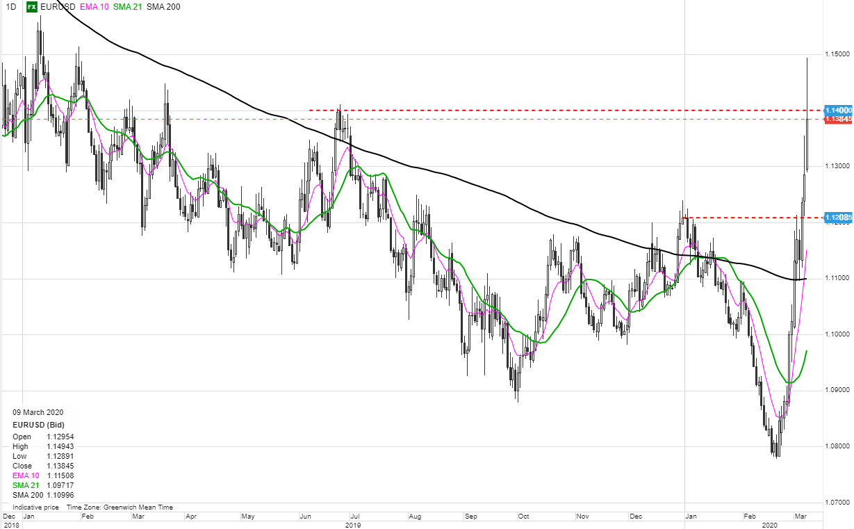 EUR/USD se postupně dostal až někam k 1,1500. Pro tento pár je typické, že nachází rezistenci na kulatém čísle, než se hned na počátku obchodování v Evropě propadl zase o něco níž. Zajímalo by mne, jestli se v tomto okamžiku nejedná jen o neudržitelné vzepjetí. Ano, pro toto zvýšení existovaly dobré důvody. Kromě jiného byla celá přední strana křivky amerických výnosů neuvěřitelně rychle sražena téměř na nulu a podobně dopadlo výnosové rozpětí EU-US po celé křivce. Kromě toho trh těsně před krizí hromadně vstupoval u eura, jakožto měny obchodů carry, do krátkých pozic. Ale jakmile dojde k úpravě pozic, je třeba zvážit, jakým obtížím Evropa při řešení krizí čelí, ať už kvůli svým problematickým politickým základům, nebo kvůli rostoucímu riziku nových existenčních obav. Při tak drastickém chování cen je těžké se držet nějaké hladiny, ale pokud jejich pohyb v závěru dne skončí u hladiny 1,1300 nebo dokonce pod ní, nelze se ubránit dojmu, že dochází k obratu. Zůstaňte na příjmu.