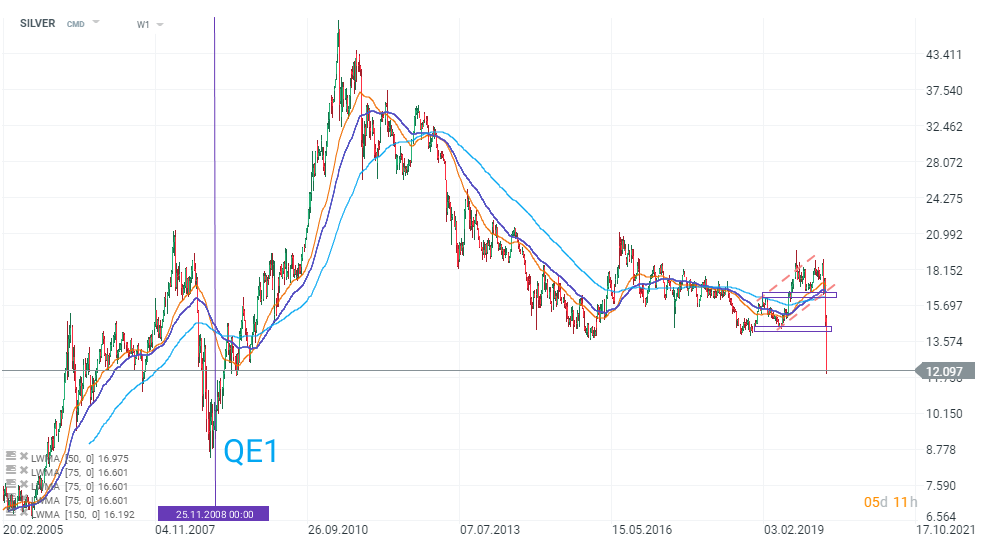 Globální trhy zůstávají extrémně nervózní kvůli dopadu šíření koronaviru. Nepomohlo ani včerejší historicky rekordní snížení sazeb americkým Fedem a zavedení programu QE4. Jednou za hlavních obětí nedostatku likvidity na trzích je stříbro, které dnes ztrácí pětinu ceny! Krátce po poledni propadlo až pod úroveň 12 dolarů za unci, což se stalo poprvé od roku 2009. Vypadá to, že trhy opouštění významní investoři, kteří jsou nuceni uzavírat dlouhé pozice. V roce 2008 jsme byli svědky podobných pohybů, nicméně začátek QE1 americké centrální banky byl pro drahé kovy pozitivním signálem.
